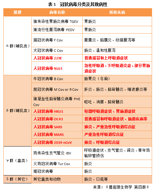 分類學上冠狀病毒屬套式病毒目-冠狀病毒科的單股正鏈RNA病毒,其復制依賴的RNA聚合酶缺乏校正功能,研究發現冠狀病毒有不連續轉錄和聚合酶跳躍的復制方式,這些特性導致病毒易發生高頻的基因重組和變異(Lai MMC et al., 1992),從而演化成不同簇群。這類病毒大家族擁有許多家庭成員,是自然界中存在的可引起家畜、家禽、寵物和人類疾病的重要病原體。根據其基因差異,分為α、β、γ和δ4個簇群,可分別感染不同的宿主引起各種臨床癥狀,α、β簇群主要感染哺乳動物,而γ、δ簇群主要感染禽類(表1)。