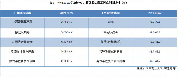 人源冠狀病毒:目前發現能夠感染人類并誘發疾病的冠狀病毒共有7種,其中3種為高致病性毒株。①是最為人們熟悉的非典肺炎病毒2003-SARS,中國科學院武漢病毒研究所的科研團隊經多年溯源性研究發現病毒源自云南地區的中華菊頭蝙蝠,揭示了“蝙蝠→果子貍→人類→人際”的傳播鏈條;②是暴發于沙特阿拉伯,席卷整個中東和歐洲地區的中東呼吸綜合征病毒2012-MERS,則是通過駱駝再傳播到人類的。③是本次發生疫情的病毒2019-nCoV,近期取得了許多進展。華中農業大學研究人員分析比對了GISAID數據庫2019-nCoV全基因組序列發現與已知的云南蝙蝠β冠狀病毒(BetaCoV/bat/Yunnan/RaTG13/2013| EPI_ISL_402131)高度相似,達96.0%-96.1%;與2003-SARS相似性為78.9-79.0%;而與其他人和動物冠狀病毒間的基因組相似性只有40%左右(表2)。中國動物衛生與流行病學中心對2019-nCoV與禽源冠狀病毒的親緣關系進行分析發現二者核苷酸同源性較低,初步排除來源于已知家禽冠狀病毒的可能性。而就在2月7日華南農業大學等單位通過對野生動物樣品的宏基因組學分析并鑒定分離自穿山甲的冠狀病毒毒株基因序列與2019-nCoV同源性高達99%,說明穿山甲為潛在的中間宿主。