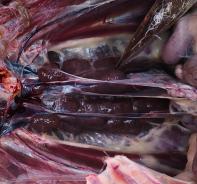 現場剖檢4只鵝,4/4只鵝出現腸粘膜脫漏、腸道充滿血樣液體、空腸回腸出現蠟樣栓塞;4/4只鵝出現胰腺有壞死點;4/4只鵝腎腫脹;呼吸道癥狀不明顯,如下圖: