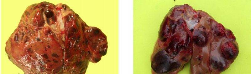 7、禽淋巴細胞白血病:肝臟異常腫大,可覆蓋整個腹腔,表面彌漫性腫瘤病灶,腫瘤表面灰白色且光滑、切面灰白色。