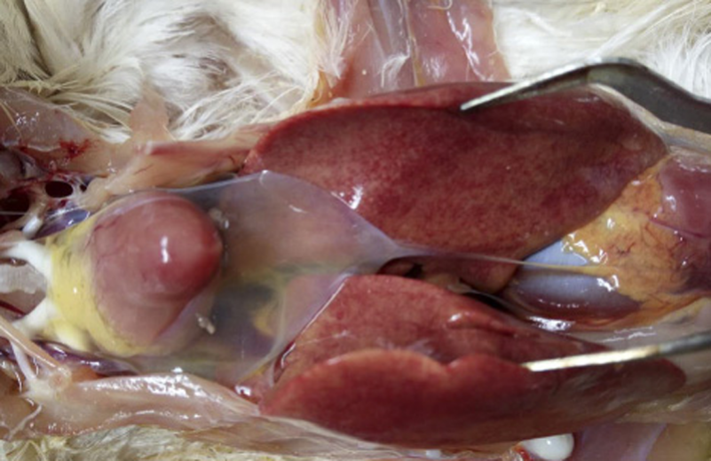 1、雞大腸桿菌病:肝臟、心臟的周圍形成一層灰白色或灰黃色纖維素性包膜,又稱作包心、包肝。