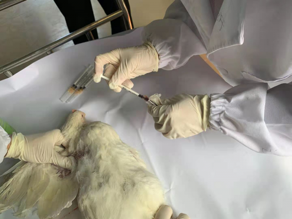 初學者往往找不到最好的下針位置,容易扎偏。建議采集者壓住皮膚不讓血管滑動,找準部位下針,或者不從血管正上方下針而是讓針尖與血管走向呈一定的角度入針。入針后針頭的走向如果確定不好也不用著急,一旦回血可以暫且不繼續入針,而是保持姿勢直接抽取。抽血時若遇到血流抽取速度緩慢,不能心急,可以稍微旋轉針頭或極輕微地往外拔一下針頭。另外,最大采血量不超過雞體重的1%。
