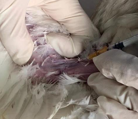 2、找到雞的臂靜脈(內側翼靜脈),靜脈位于二頭肌和三頭肌之間的翅膀下,與肱骨、臂骨平行,區域類似三角形,幾乎無羽毛覆蓋,很容易找到。